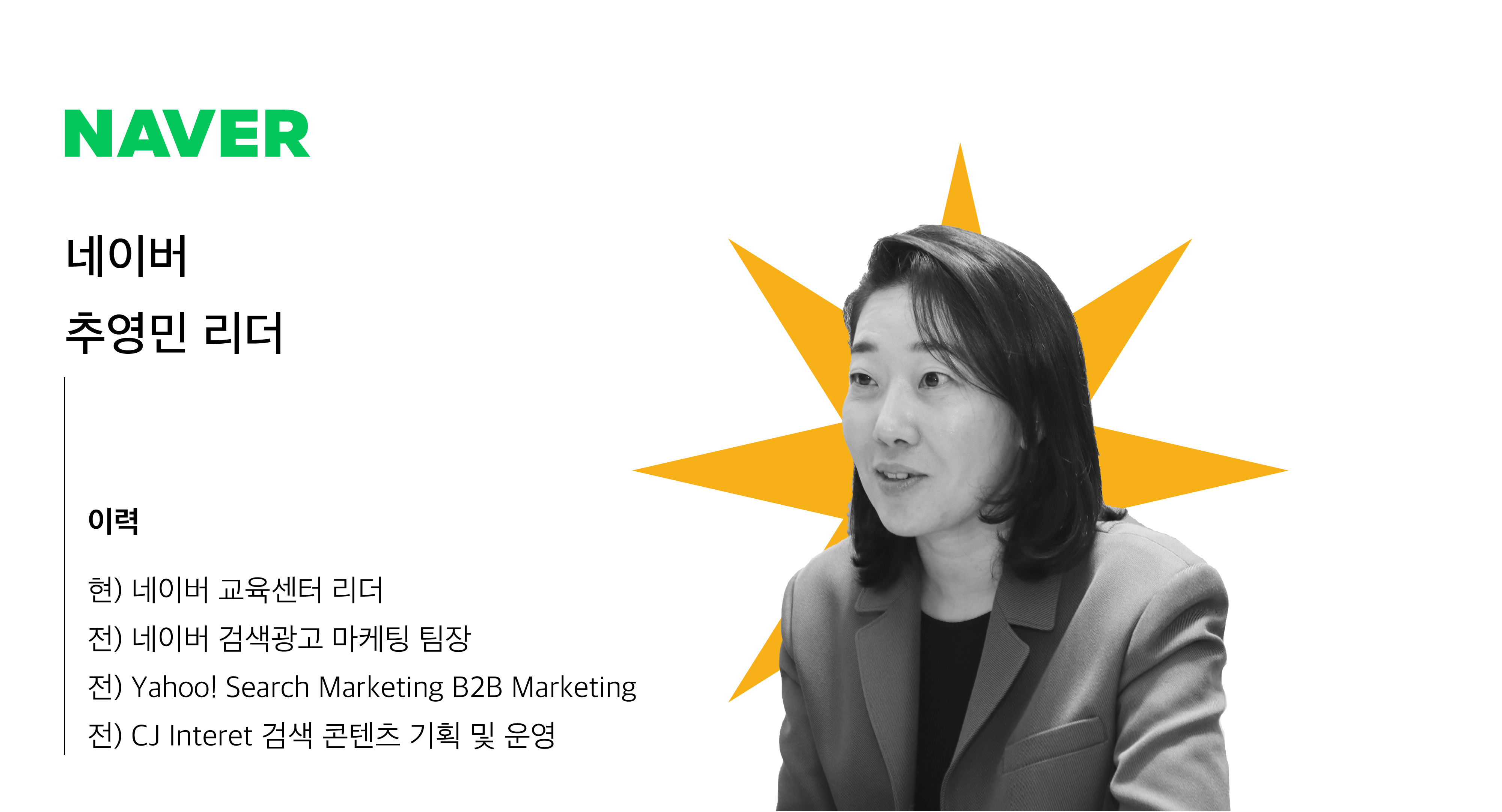 Yahoo!Search Marketing에서 B2B 마케팅 업무를 통해 사업자와 파트너를 위한 콘텐츠 제작 및 커뮤니케이션에 대한 경험을 쌓기 시작했습니다. B2B 온라인 커뮤니케이션 스킬과 오프라인 행사 기획 등의 경험을 기반으로 사업자와 파트너를 이해하고 그들을 위한 콘텐츠 제작에 전문성을 갖고 있습니다.
